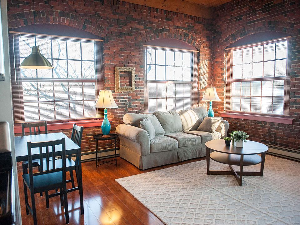Bright open condoCentral airExposed brickWood ceilingsGiant windows