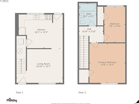 Two bedrooms both upstairs. One bedroom is large and the other (guest room, office) is smaller.