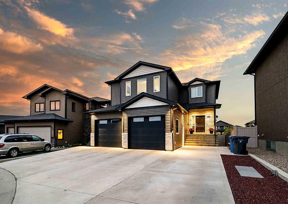 Welcome to your dream family home—an impeccably designed two-storey with walk-out basement, nestled in a quiet Ranchlands cul-de-sac. Backing onto expansive green space and walking paths with no rear neighbours, this custom-built property offers privacy, timeless finishes, and a layout that truly delivers. Boasting 5 bedrooms—4 upstairs + Laundry room!—this home is ideal for families of any size. The heart of the home is a stunning kitchen featuring an oversized island, GRANITE countertops, gas cooktop, built-in double ovens, hidden microwave storage, and premium Kenmore Elite appliances. A walk-through pantry leads to a spacious boot room with plumbing for an optional second laundry setup. The open-concept main floor living and dining areas are warm and inviting, anchored by a gas fireplace and complemented by a custom wet bar with undercabinet and feature lighting. Step onto the upper patio, where built-in speakers, a gas BBQ hookup, and an outdoor fireplace set the stage for unforgettable evenings—all overlooking peaceful green space. Upstairs, the luxurious primary retreat includes a cozy gas fireplace, undercounter beverage fridge, and multiple custom closets with integrated lighting—including separate closets for shoes, gowns, and long coats. A private balcony offers uninterrupted views, while the spa-like en suite features a deep soaker tub with vintage telephone-style faucet, a walk-in tiled shower with dual showerheads, elegant tile floors, and quartz countertops—a finish found throughout every bathroom in the home. Three additional upstairs bedrooms share a stylish 5-piece bath with double sinks, while a spacious laundry room adds everyday convenience. The fully developed walk-out basement offers even more space to relax and entertain, with a family room featuring a gas fireplace, games area, fifth bedroom, and full bathroom with steam shower. IN-FLOOR HEATING ensures comfort year-round. Enjoy whole-home audio with integrated speakers in the kitchen, en suite, and outdoor areas, controlled via wall panels or an app-connected amp. Thoughtful extras include soffit outlets for holiday lighting, a front plug-in for RVs or yard décor, and built-in holiday timer switches. The backyard is a private oasis, beautifully landscaped with lava rock, perennials, underground sprinklers, two concrete patios, a privacy blind, and a Bullfrog hot tub with updated cover and lighting. The oversized 26x27 heated garage is fully finished with built-in shelving, cabinets, floor drain, and side-mount door openers. Additional highlights: triple-pane windows, in-floor heating, newer shingles, 125-amp panel, dual-zone furnace (new motor in 2023), hot water tank w/ repaired evaporator coil, RO water system, and softener. Surrounded by parks, trails, and close to schools and amenities, this home is a rare gem in one of Medicine Hat’s most desirable communities. Contact your real estate agent to book a private showing today!