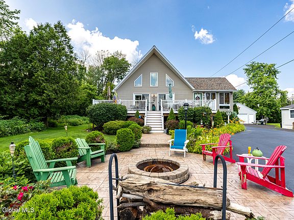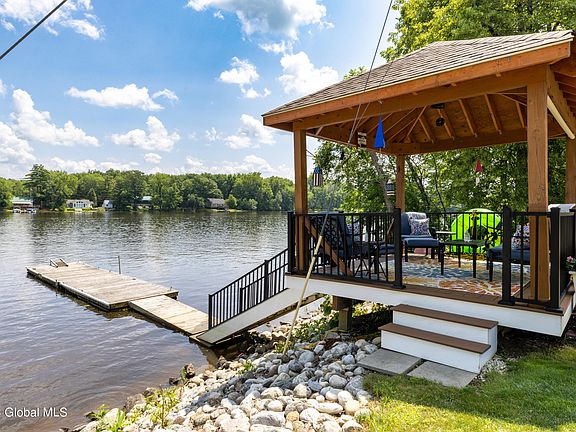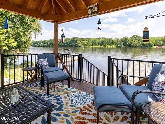 Enjoy waterfront living in this custom year round home! 64' on Hudson River with your own private gazebo & dock. The Adirondack style home is truly a pleasure with so many custom upgrades. Featuring a 1st floor primary suite with massive walk-in closet & bath with heated floor. Custom cherry kitchen with granite & pounded copper island. And those handscraped hardwood wood floors, just beautiful. Newer roof, furnace & tankless on-demand hot water. You choose where to take in the view from the 3 season room to the trex deck or on the stamped concrete patio with fire pit. 2 car detached garage, generac generator, irrigation system & even a robotic mower, let it do the work while you enjoy life on the river! 15 miles of waterway to travel without passing through a loc