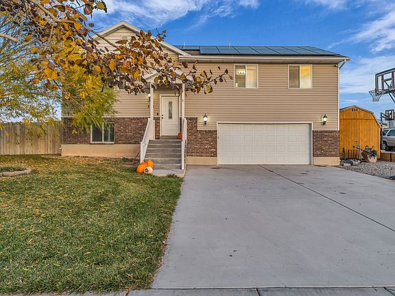 Experience comfort, style, and modern efficiency in this beautifully maintained 3-bedroom, 2-bath home in Tremonton. Built in 2014, this property offers long-term value with fully owned solar panels installed in 2021, providing dependable energy savings month after month. The open-concept main level features vaulted ceilings and generous natural light. The kitchen stands out with rich knotty alder cabinetry, granite countertops, and quality appliances, creating a warm and functional space for cooking, dining, and gathering. The adjoining living area offers a clean, comfortable layout ideal for everyday life. The private primary suite provides a relaxed place to unwind, with a well-designed bathroom and practical closet space that keeps the room open and uncluttered. Throughout the home, a mix of hand-scraped hardwood, tile, and carpet adds durability and comfort where it matters. The unfinished basement provides significant room for expansion, giving you the option to add future bedrooms, a family room, storage, or custom space tailored to your needs. Outside, the fully fenced backyard is a key highlight. You'll find a spacious patio that's perfect for outdoor dining, grilling, or entertaining, along with plenty of lawn space for kids, pets, or projects. A large 1220 shed adds excellent storage or potential workspace, a rare bonus in this price range. Mature trees and a quiet setting give the yard added privacy and charm. With a low-maintenance vinyl and brick exterior, an attached two-car garage, and convenient access to parks, schools, and local amenities, this home combines capability, comfort, and location in a highly functional package. Homes with this kind of space and flexibility don't come around often.