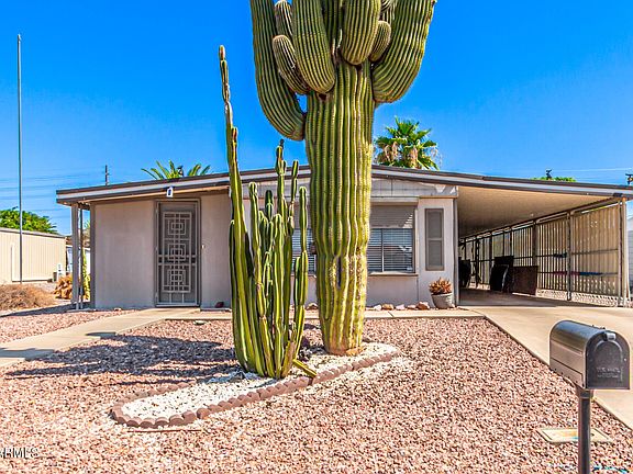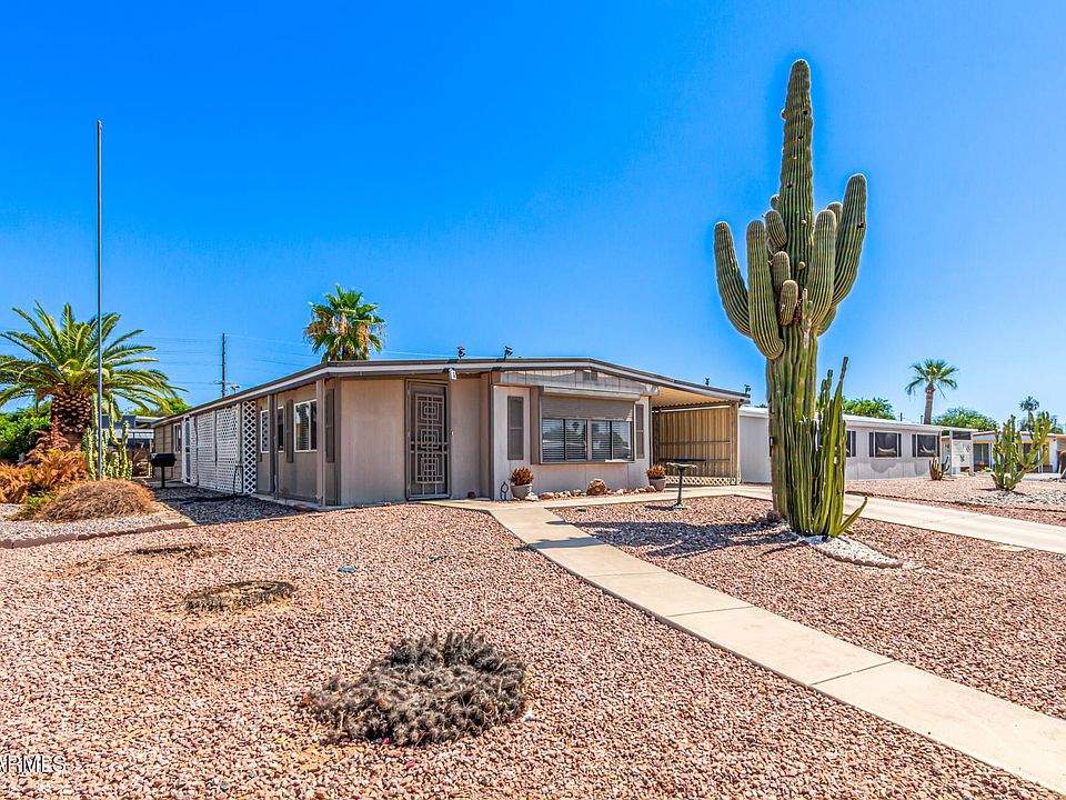 Welcome to Mesa East, a vibrant 55+ community where you own your land and enjoy the comfort of true city living with paved streets and a real Mesa address. From the moment you arrive, you'll be greeted by a majestic saguaro cactus standing proudly in the front yard—a striking welcome to your new home.