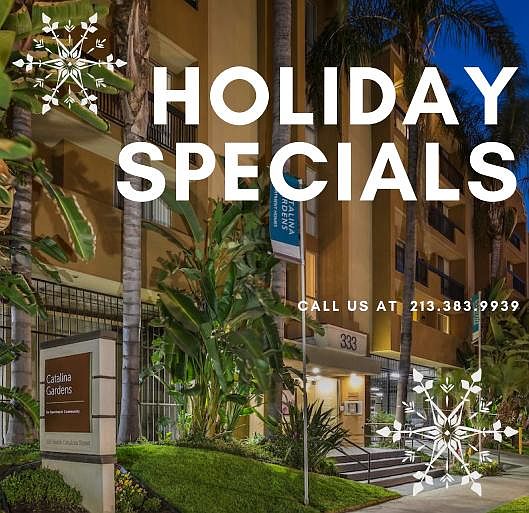 Catalina Gardens Apartments 333 South Catalina Street Los Angeles, CA 90020 Make a home that is uniquely you at Catalina Gardens apartments in Los Angeles, CA. Our inviting community features 1- and 2-bedroom apartment homes designed with your comfort and convenience in mind. Each residence features central air conditioning, spacious storage, and a kitchen with gas range. Around our pet-friendly community, enjoy amenities that perfectly complement your lifestyle. Take a dip in the pool or lay out on the sundeck with a book. After a long day, skip the gym and workout in our fitness center or relax in our spa. At Catalina Gardens, you can have it all. As part of the Essex Communities at Koreatown, Park Catalina is one of four unique properties that comprise our K-Town collection, which includes the neighboring communities of Park Catalina, Regency Palm Court, and Windsor Court. Just outside our community, you will be surrounded by the vibrant Koreatown neighborhood. Find adventure around every corner with delicious restaurants, quirky shops, and endless entertainment. When it's time to venture farther, connecting to major commute routes to the rest of LA is easy. Major freeways are just minutes away, plus our location gives you access to many public transit options including the Metro. OPEN HOUSE - FRIDAY - SUNDAY WITH LOW RATES + AMAZING SPECIALS! Celebrate the Season! Save big when you sign today! Don't miss savings of up to $500 at move-in. Valid on select homes for new applicants w/ approved credit. Subject to availability and conditions apply. Expires 12/8/21. 30-Day Satisfaction Guarantee If you are not 100% satisfied with your home, you may transfer to a comparable residence within the community or terminate your lease. Some restrictions may apply.