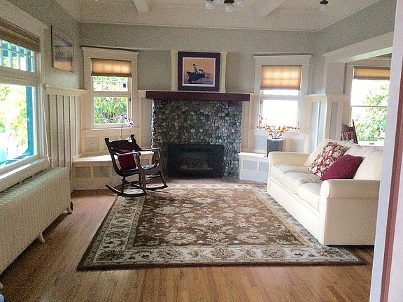 This charming, historic 1910 home is a fantastic restoration. Enjoy the wonderful Bay and Island views from the newly added second story, the living area or while relaxing on the covered front porch with beautifully hand-crafted spindle pillars and curving staircase. It features a fully remodeled gourmet kitchen with shaker cherry cabinetry, walk-in pantry and in-floor heated entry. The open living and dining areas feature hardwood floors, window seats, two river rock fireplaces and a fantastic box-beam ceiling. These rooms also have crafted wall shelves, chandeliers recovered from the Mount Baker Theater and wains coating. The living room has a gas insert fireplace. The newly added upstairs master suite features a sitting area to watch the sunsets and bay views, an office/work space, 2 walk-in closets and attic storage. It has many hand-crafted, customized features, including in-house vacuum system. The master bath has in-floor heat and a steam shower. Two bedrooms on the main floor share a bathroom, which has radiant heat in the floor and a jetted tub/shower. Energy audit recommendations were followed, including insulating the basement. The house has energy efficient appliances and low-flush toilets. The yard has been fully landscaped.