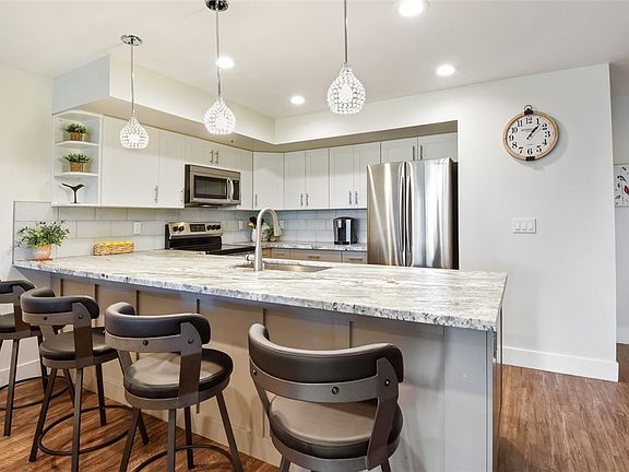 This is single level living at its best. No stairs with elevator access from the covered parking area. This fully furnished, one bedroom, two full bath, unit has been completely remodeled with an open floor plan, beautiful laminate flooring and all new kitchen. The kitchen has new cabinetry, all stainless appliances, quartz counters and breakfast seating. This home is open, bright and airy.