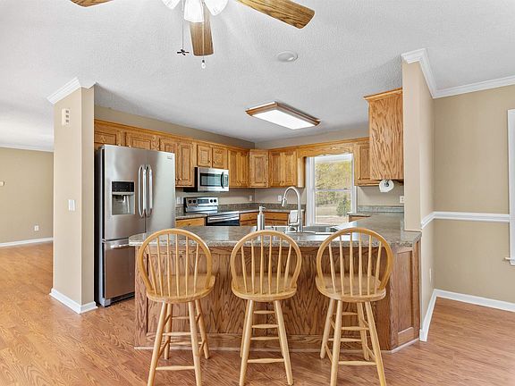 Welcome to your slice of country charm! This 3 bedroom 2 bath home offers the space and serenity you've been searching for. Set on a generous piece of land, there's room to roam, grow a garden, or simply soak in the peaceful surroundings. Step inside to a cozy, freshly painted interior with a split floor plan that gives everyone a little extra elbow room. The kitchen features ample cabinets and countertops, as well as a built-in bench where you can sit with your morning coffee and watch the sun rise. Out front, a classic rocking chair porch invites you to slow down and take in the view of wide open skies and the neighboring pond. Out back, a brand new deck is perfect for relaxing or hosting friends. The two car garage offers plenty of storage and a designated RV parking area is ready for your camper, boat, or trailer. With a new roof added in 2021, this home is ready for its next chapter..make it yours and be ready to enjoy the life this piece of paradise offers!