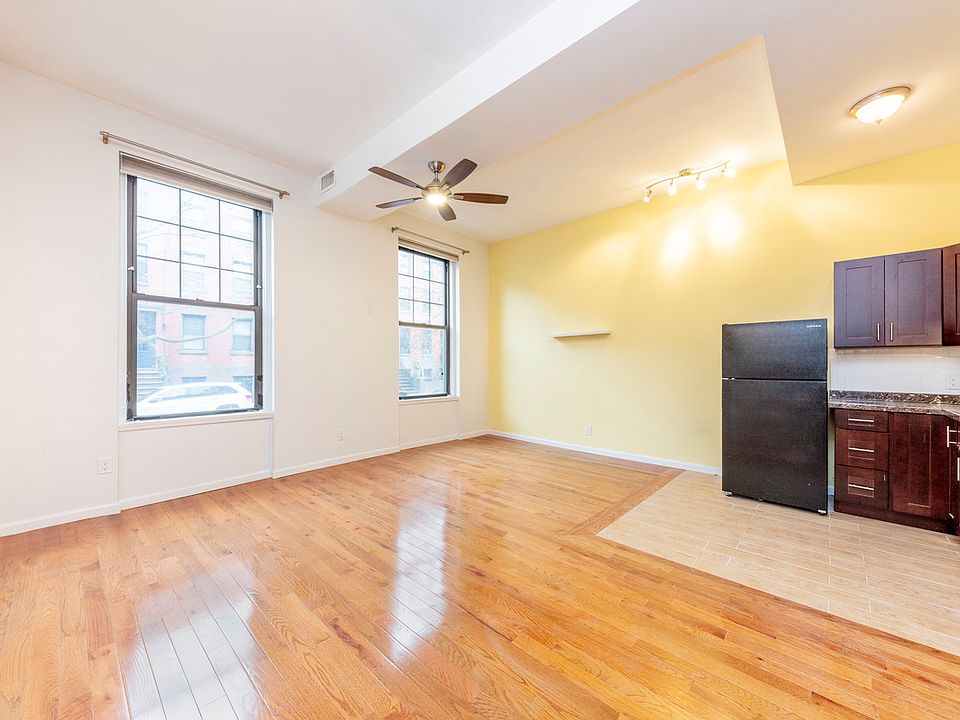 When you walk into this Loft Studio you will notice the 15ft ceiling height, oversized windows in this large bright studio on the parlor floor or a townhouse. Situated in a charming townhouse just a block away from the F G stop on Carroll St. New renovations include hardwood floors, a new kitchen with cabinets, countertops, appliances. There is an open kitchen with track lighting and ceiling fan. There is a large double size closet with overhead storage The bathroom is also new and modern with white subway tiles. This studio loft boasts tons of natural sunlight with its oversized windows and ceiling height. Central heating. Pets are on approval. Just off busy Court St and Smith St restaurant row where you will have tons of cafes, restaurants, bars, markets and shops