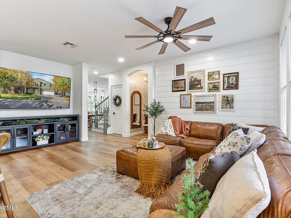 Nestled along a picturesque, tree-lined drive surrounded by lush greenery, this 3-bedroom (Plus 2 rooms with windows that can be used as bedrooms), 3-bath home blends timeless Victorian charm with traditional elegance. Featuring extensive upgrades and luxurious finishes throughout, every space feels warm, inviting, and beautifully designed. Step outside to a backyard with newly installed artificial turf. Perfect for low-maintenance enjoyment and stay comfortable year-round with a newer A/C unit. Enjoy the unbeatable location, just a short walk to the iconic Four Silos, Bashas, and Starbucks, as well as the scenic community lake ideal for peaceful walks and catch-and-release fishing. Plus, a brand-new Mountainside Fitness facility is currently being built just up the road, adding even more Experience classic beauty and modern living in one of Gilbert's most beloved communities.