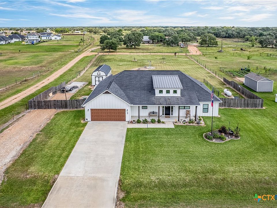 This custom-built ranch-style home combines luxury and functionality with its stunning white board and batten exterior, black-framed dual-pane windows, and elegant wood columns. Inside, you'll find a private office, open-concept split floor plan, and a spacious living room with 13’ ceilings and floor-to-ceiling windows overlooking a large covered patio and custom gunite pool. The kitchen features 42” cabinets, granite countertops, walk-in pantry, and dining area. The primary suite boasts dual sinks, a freestanding tub, separate shower, and his-and-hers walk-in closets. Additional highlights include LED lighting, a 22x22 garage with storage, full irrigation, programmable security lights, and a heated/chilled saltwater/chlorine pool with LED ambiance. Fiber internet, privacy fencing, extra gravel drive, and zoning to Industrial ISD complete this exceptional offering. Schedule your private showing today!