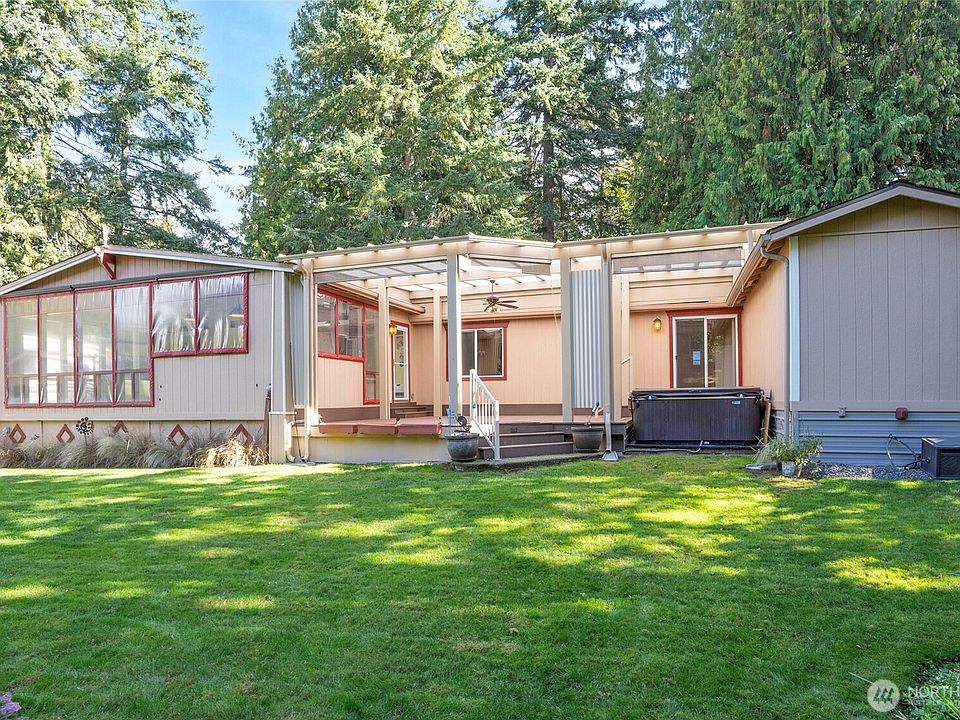 This isn’t your average manufactured home—it’s a complete lifestyle upgrade! Enjoy a remodeled kitchen with SS appliances, a massive WIC, & 280 SF entertainment room designed for fun & comfort. Host friends in the industrial-style living space that flows seamlessly to a covered Trex deck with a hot tub. Need extra space? The separate 520 SF flex building is perfect for a home office/studio, or your finishing touches. Updates include a new roof, siding, heat pump, & generator wiring for peace of mind. With multiple sheds, garage, carport, & gated RV parking, storage is never a problem. Step outside to a flat, beautifully landscaped yard with a firepit & even an outdoor movie screen—this home blends practicality with playful living perfectly.