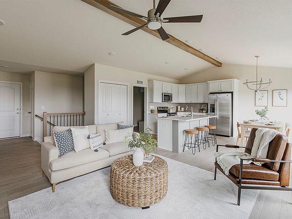Quality construction & eye-catching details at an affordable price! Kimberley’s brand-NEW O’Shea ranch plan has 3 beds, 2 baths, 1,390 SF, 2 car garage w/ openers/keypad, daylight basement & so much more! The spacious living room-dining-kitchen area has vaulted ceilings, wood beam in vaulted ceiling, lots of windows, electric fireplace w/ wainscot paneling, tile backsplash, large pantry, Waterproof LVP flooring, Quartz countertops, SS appliances w/ refrigerator included, center island, painted cabinets, & slider door to deck. Laundry room w/ big mudroom bench off the garage. Owners' suite has wainscot paneling on bed wall, fan/light & its own private bath w/ 2 sinks, big shower, & ample sized closet. Basement has plenty of storage space & is pre-plumbed for bath & ready for future finish. Other amenities: No maintenance vinyl siding, rounded drywall corners, 30-yr shingles, Tyvek wrap, 10X10 deck, cultured stone, landscaping & fully sodded yard. 1 yr. builder warranty & 5 yr. tax abatement included. Development is conveniently located close to parks, trails, shopping & schools. Use Preferred lender & get up to $2,000 in closing costs. All photos are of the actual home.