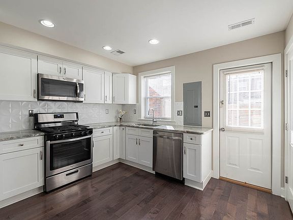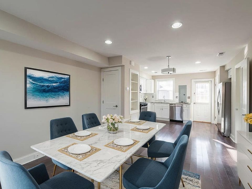 Beautiful fully renovated light filled two bedroom two level rowhome with newer exterior gray paint.
