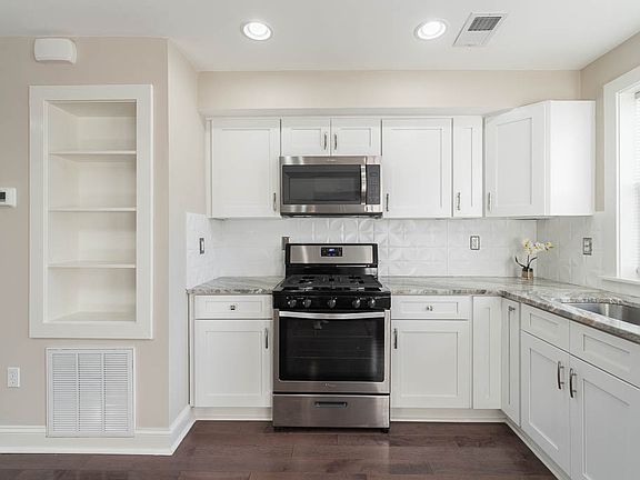 White backsplashLovely backyard spaceNewer exterior gray paintGranite countertopsTerrific closet spaceWasher and dryer in-homeModern fixtures and finishes
