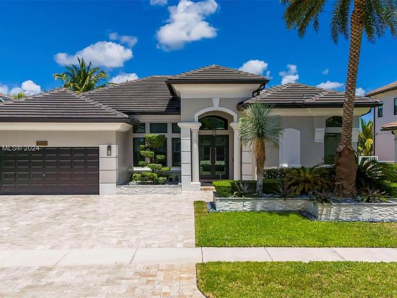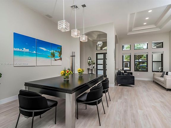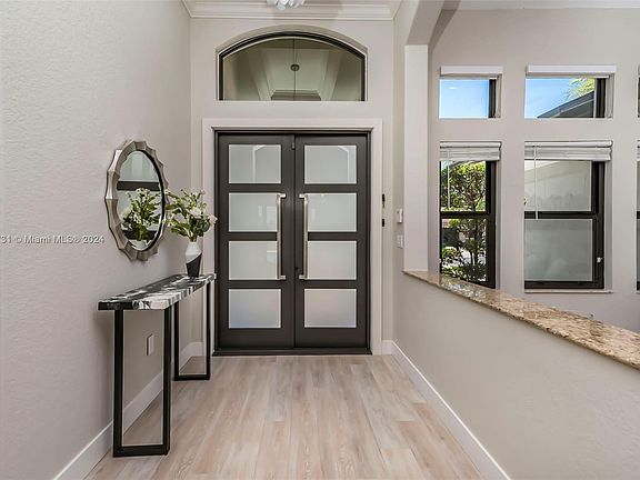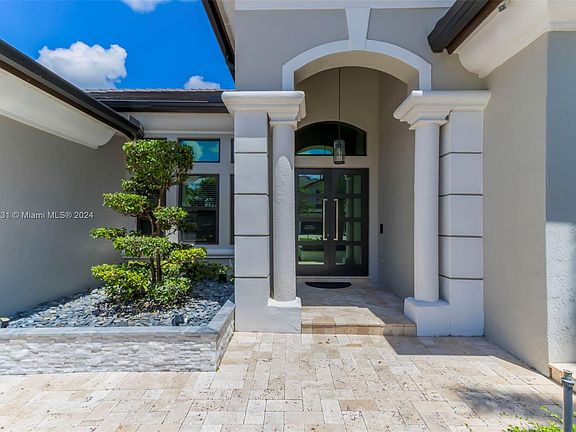 Beautiful single-story lakefront home in the quiet gated community of Grand Isles in Sunset Lakes! This 5-bedroom, 3-bath home features renovations inside and outside, including hurricane impact windows/doors, roof, flooring, A/C, driveway, pool pavers, and more. It features high-end finishes, renovated gourmet kitchen with quartz countertops, stainless-steel appliances, and spacious 12-foot ceilings. The fenced-in backyard has stunning lake views and beautiful salt-water pool perfect for unwinding and entertaining. Other features include a modern pool table that converts to a sleek dining table, integrated EuroCave Pro wine fridge, and an amazing luxurious spa-like primary bathroom! Make this bright and spacious turn-key retreat your new home.