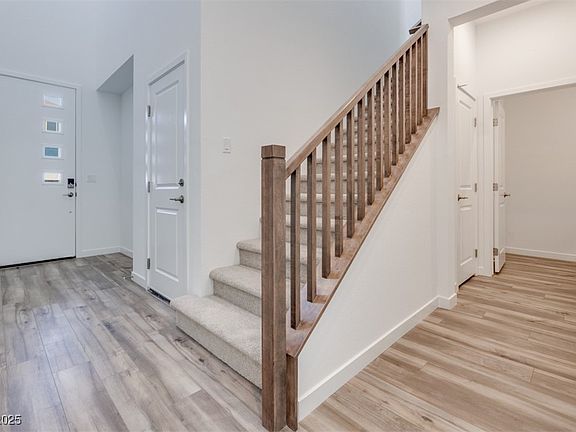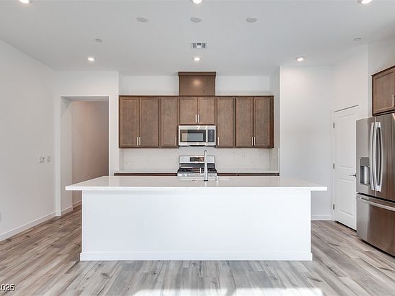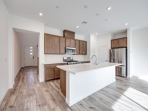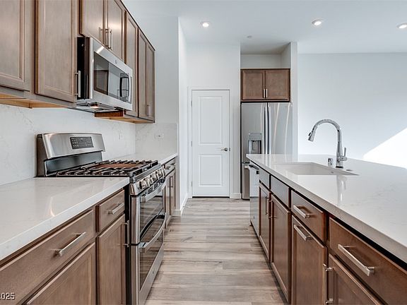 Options, financing, and closing costs incentives available. Speak to on-site sales agent for details. Beautiful modern brand new 2 story townhome in desirable Inspirada. This townhome has many features throughout. The spacious kitchen boasts a beautiful quartz island and countertops with the living room is just off the kitchen and overlooks the backyard. Upstairs boasts the spacious loft, laundry room, and primary bedroom with en suite bath boasting double sinks with lovely hardware.