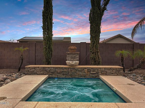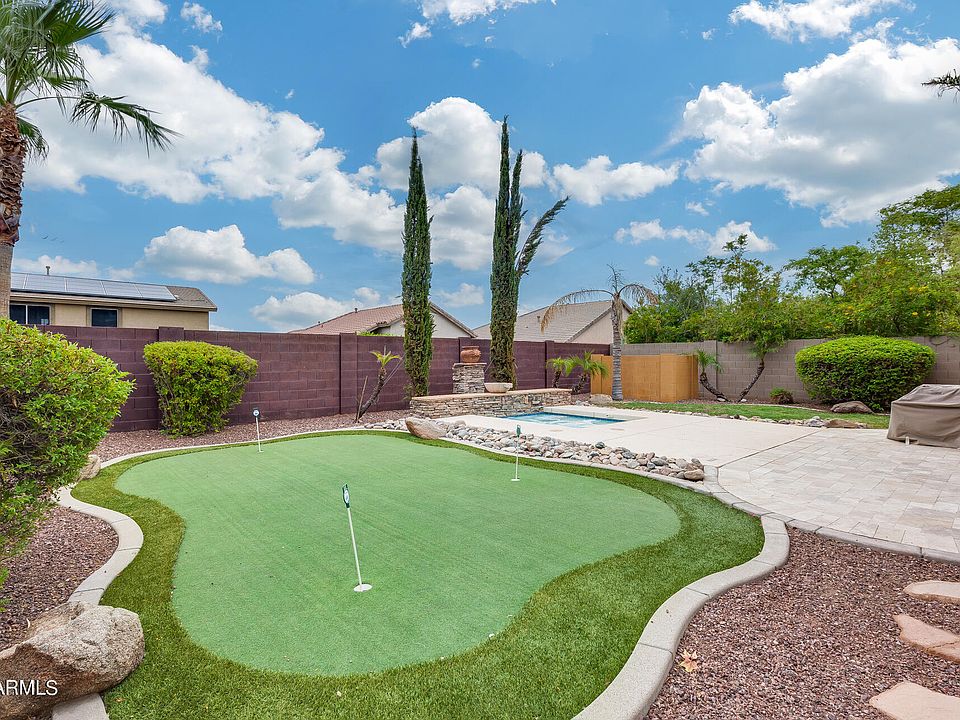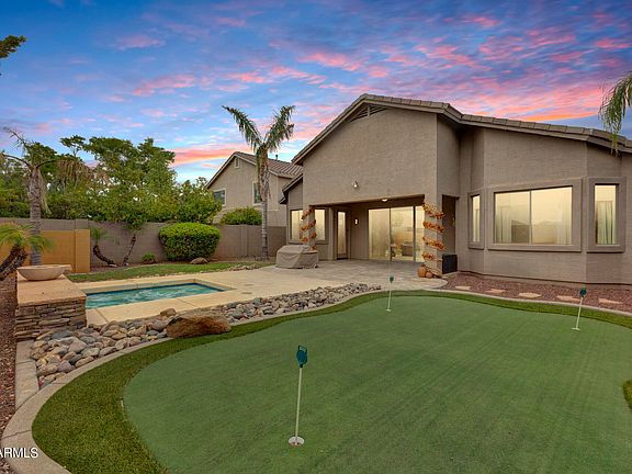 Prime location just 4.1 miles from TSMC. This open floor plan features 4-bedrooms, 2-bathrooms in it's 2,112 sq ft of spacious living. It has 10ft ceilings and an abundance of natural light throughout. The kitchen has upgraded cabinets, granite countertops, a pantry, kitchen island with custom stone accents, breakfast nook, and a formal dining area. Enjoy cooking on the gas range or double ovens. The living room centers around a custom electric fireplace. Just outside, the covered patio leads to a beautifully landscaped backyard with grass, shrubs, and a private pool that is approximately 9x9, with remote operated heat and jets. Enjoy the putting green and ample privacy in the fully fenced backyard. The 4th bedroom offers versatility with the option of using it as a bedroom or den.