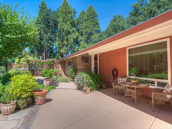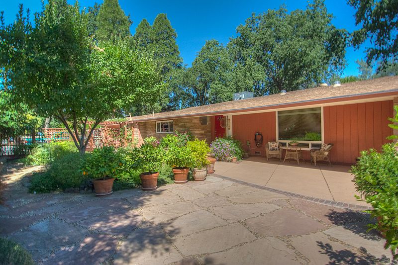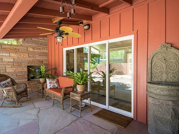 One of a kind custom Sandstone marvel! Courtyard entry separates you from the rest of the world. Every bedroom has a slider opening to a patio which brings you to the verdant landscaping and tall trees. Gated RV parking. Prodigious water well to the home and irrigates the rich river loam yard at nearly no cost. Inside, lightly remodeled bathrooms and classic kitchen completes the experience. Vaulted livingroom with gas fireplace in Sandstone looks out onto a north facing patio with a built in fireplace of its own. Several highly productive cherry trees are among the incredible gardens and flagstone patios. Figs, grapes, olives, bulbs and more. A gardener's dream! This very special home is literally across the street from many million-dollar homes.