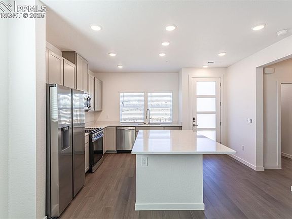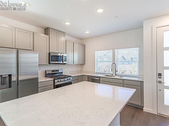 Ready for move-in, the popular new Conrad floorplan brings 1,349 square feet of thoughtfully designed living space across two stylish stories. Featuring 3 bedrooms, 2.5 bathrooms, and an attached two-car garage, this popular layout blends everyday convenience with elevated finishes. Step inside to an expansive kitchen that flows seamlessly into the open great room, perfect for effortless entertaining and comfortable living. The kitchen showcases Samsung stainless steel appliances, a spacious center island, quartz-style countertops, and warm wood-toned cabinetry from the sophisticated Telluride interior color package. Upstairs, the private primary suite offers a large walk-in closet and a luxurious en-suite bathroom featuring dual vanities, a walk-in shower, premium Kohler fixtures, and lighted mirrors with adjustable color settings for an added touch of luxury. Two additional bedrooms, a full secondary bathroom, and a conveniently located laundry room complete the second floor, creating a smart and functional living experience. Enjoy high-quality Shaw flooring on the main level and plush, water-resistant carpeting upstairs, balancing style and durability. Smart home features like a Ring video doorbell and a smart garage opener with built-in video capabilities add extra convenience, security, and peace of mind. Located in The Vistas at West Mesa in Colorado Springs, the Conrad offers easy access to Garden of the Gods, Pikes Peak, UCCS, downtown amenities, and major military bases including Fort Carson, Peterson, and Schriever Air Force Base. Don’t miss your chance to own one of our most popular new designs, where elevated finishes and modern functionality come together perfectly.