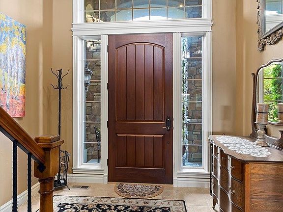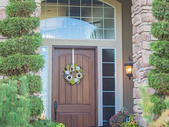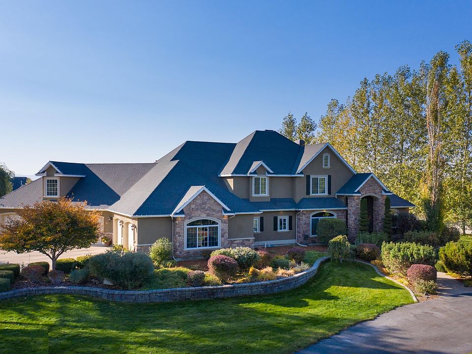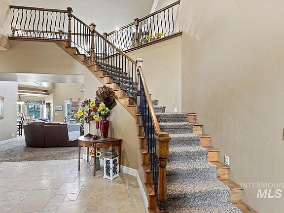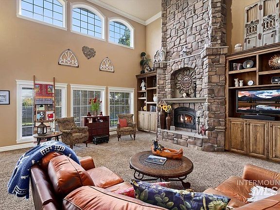 Superb custom home on 1.74 acres just minutes from Twin Falls, Shoshone Falls, Dierkes Lake, and walking trails. This 2-story home features a striking floor-to-ceiling rock fireplace visible from the kitchen, dining, living area, and the upper bridge/office. The kitchen offers granite countertops, multi-colored cabinets, a center island, stainless steel gas oven/range, refrigerator, dishwasher, microwave, built-ins, and a large walk-in pantry. The main-floor primary suite includes a double-sided gas fireplace shared with the jetted tub, a door-less walk-in shower, custom cabinetry, and double sinks with granite. A second main-floor bedroom has its own bath with a wheelchair-accessible shower—ideal for guests or extended family. Upstairs are two bedrooms with a Jack-and-Jill bath plus an entertainment room with sink, microwave, and mini-fridge. Attached is a spacious 5-bay garage. The park-like backyard offers an oversized covered patio, gazebo gathering area, storage shed, small greenhouse, and playground equipment surrounded by mature trees.