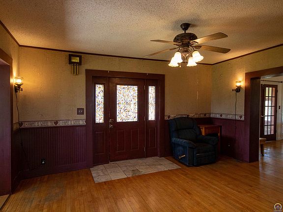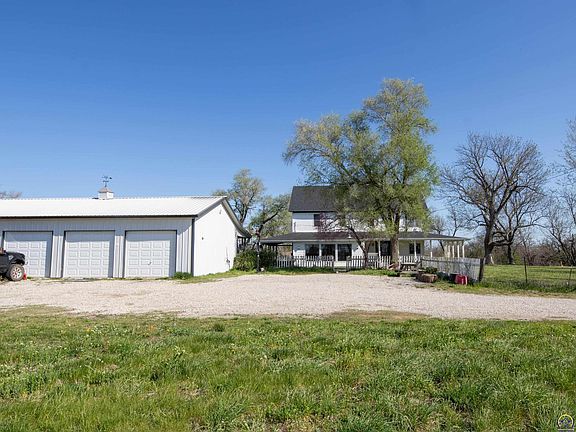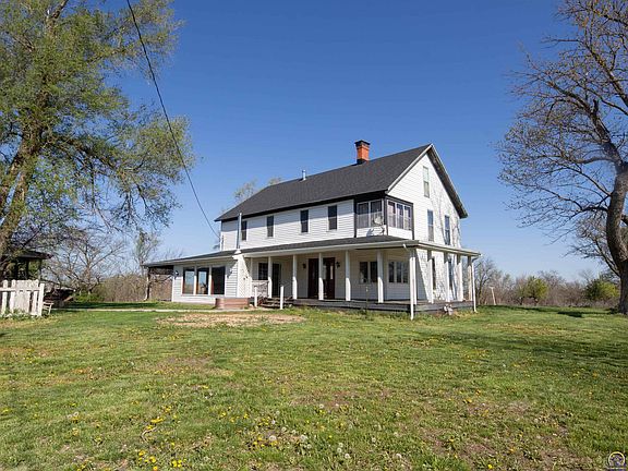 What a location! This 5 bedroom 2 bath 2 story home sits on blacktop within 1/2 mile of Hwy 56 and close to Admire turnpike entrance. Modern farmhouse built like a tank in 1888 with laid up rock walls and includes a gorgeous wrap around porch and yard! What a price as the stately home sits on a total of 8.8 acres with lots of trees and wildlife! The sellers just installed a brand new composition roof and gutters in 2024. Some updates have been made to the kitchen and both bathrooms over the last few years. The main floor offers a newer heat and air system that is approximately 6 years old, and a furnace for the 2nd floor with window AC. With the duct work already in place, a buyer could add central air to the 2nd level as well! An awesome sun room on the main floor with a hot tub, lots of great windows and a nice wood burning stove to keep warm for the winter months! Fairly low maintenance on the outside with vinyl siding. The property also includes a newer detached 30 x 50 garage (Lester building) that has three overhead doors, concrete floor, and a 200 amp electical panel. There is also a smaller outbuilding that could work great for livestock. Sewer line to lagoon was completely replaced in summer of 2023! This home has so much to offer being located right off blacktop and on the outskirts of Admire. City water, lagoon with natural gas for heat! This is a must see while it lasts!