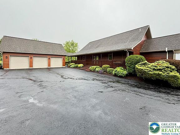 Tucked away at the end of a private drive through the woods, you'll discover the peaceful retreat you've been searching for. This stunning 13+ acre property sits atop a hill, offering breathtaking 180-degree views of the Lehigh Valley, perfect for those craving tranquility and seclusion from the hustle of everyday life. Inside, natural light floods the home through floor-to-ceiling windows. The great room features soaring 18-foot ceilings and a striking stone wood-burning fireplace, seamlessly connecting to an open-concept kitchen designed for entertaining. Three sets of glass doors lead from the back of the home out to a massive wrap-around deck—ideal for family gatherings or simply soaking in the serene countryside and abundant wildlife. An additional patio off the family room offers even more outdoor space. You'll also love the oversized three-bay garage, complete with a full-sized upper storage area that could easily be converted into additional living space. Enjoy updated bathrooms, a gorgeous main suite with an expansive walk-in closet, a main-level office, and convenient first-floor laundry. There’s so much to see and love in your new home—schedule your showing today!