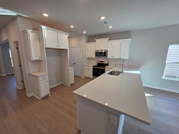 Step inside to an open-concept floor plan filled with natural light. The main level features a welcoming living area, dining space, and a modern kitchen with stainless-steel appliances, a large island, granite countertops, and a walk-in pantry. Luxury vinyl plank flooring and neutral coastal tones give the home a bright, airy feel.