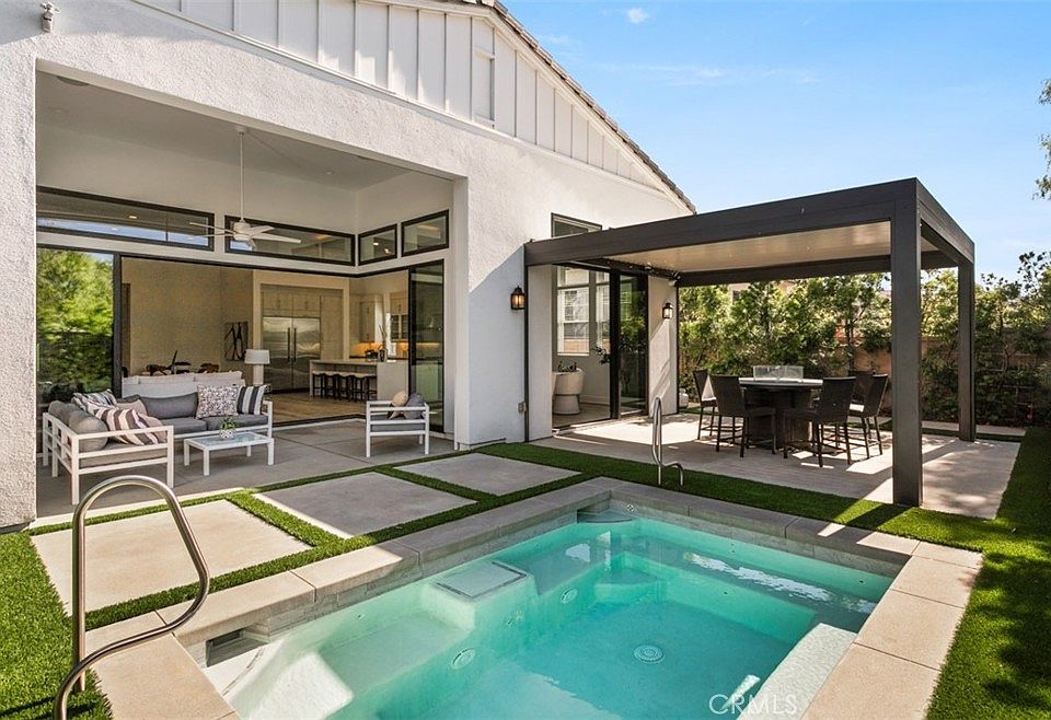 Outside, two covered patios with an amazing display of electric awnings and shades, overlook a sparkling jetted, heated, plunge pool, creating the ideal setting for sunset dinners or lazy weekend afternoons. Every detail of this refined coastal haven celebrates the beauty of single-level luxury living in San Juan Capistrano.