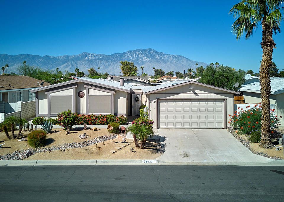 Beautifully Updated Home with Mountain Views in Tri Palm Estates & Country Club!Welcome to this stunning 2-bedroom, 2-bath home nestled on a quiet cul-de-sac in the sought-after Tri Palm Estates & Country Club, an active 55+ golf community where YOU OWN THE LAND. This newer home offers vaulted ceilings, an open-concept floor plan, and stylish upgrades throughout. Enjoy a modern kitchen with granite countertops, gas cooktop, double ovens, and updated fixtures. The cozy living room features a fireplace and large windows framing lovely mountain views. The spacious owner's suite includes a custom roll-in tile shower and updated bathroom. Both bathrooms and flooring have been thoughtfully remodeled, and built-ins add character and functionality.Step outside to your private oasis--an enormous covered patio perfect for entertaining, complete with swag lighting, patio furniture, and a large private hot tub.Best of all, THIS HOME IS ON A MERNENT FOUNDATION WITH FORM 433A, making it eligible for easy financing.Community Perks:Tri Palm Estates offers unlimited fee-free golf on both an 18-hole and 9-hole par-3 course, plus access to swimming pools, spas, tennis, pickleball, shuffleboard, and more. The clubhouse features a restaurant, bar, banquet room, billiards, and free Wi-Fi.Located just minutes from Costco, Home Depot, Agua Caliente Casino, Eisenhower Medical Center, and Acrisure Arena, with easy access to I-10 for quick trips to Rancho Mirage, Palm Desert, and downtown Palm Springs.Don't miss this opportunity for affordable luxury in one of the desert's best active adult communities!