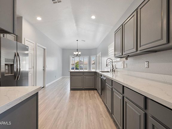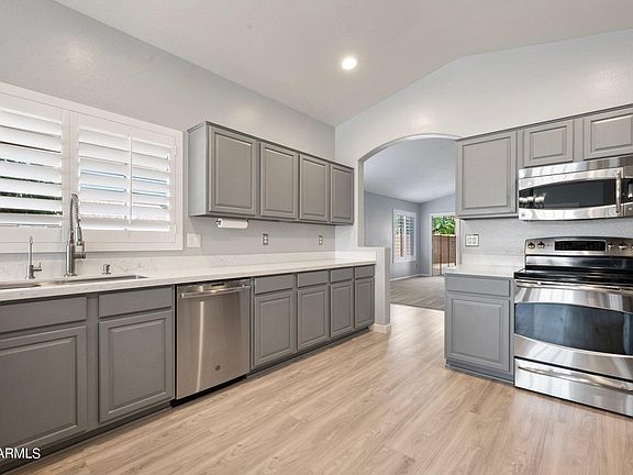 This 3-bedroom, 2-bathroom beauty offers modern upgrades and comfortable living. Step inside to brand-new vinyl plank flooring, plush new carpet, and stylish plantation shutters that add elegance and privacy to every room. The updated kitchen is a chef's dream, boasting sleek quartz countertops, brand-new stainless steel appliances, and ample cabinet space. The spacious primary bedroom offers private office space, perfect for remote work or a cozy reading nook. The bathroom has been upgraded with a tiled shower, adding a spa-like feel to your daily routine. Step outside to your own backyard pool with a removable safety fence. Located in a desirable Gilbert neighborhood, this home is close to schools, shopping, dining, and easy freeway access.