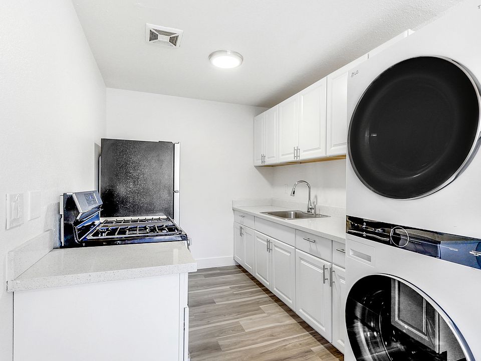 New laminate flooringStainless steel refrigeratorStainless steel gas rangeQuartz counter topsNew carpets in bedroomsNew kitchen cabinetsGas furnace