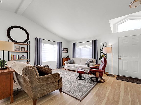 Lovely single-level home in the highly desired Lakeridge Of Eugene 55+ gated community, Pet friendly, 2 Bed 2 Bath, open floor plan, new roof & skylights in 2024, HVAC was updated in 2018, laminate flooring, Washer & Dryer Included, outside storage room 11x8.5'. Space rent is $847 per month and this community features a small lake with a walking trail, Space rent includes, indoor community pool & hot tub, exercise room, community gathering room, billiards room, exercise room, security gate, water, sewer, and trash services. For a fee you also have access to RV/Boat storage, mini storage units and a car wash area. Buyer must be approved by the park.