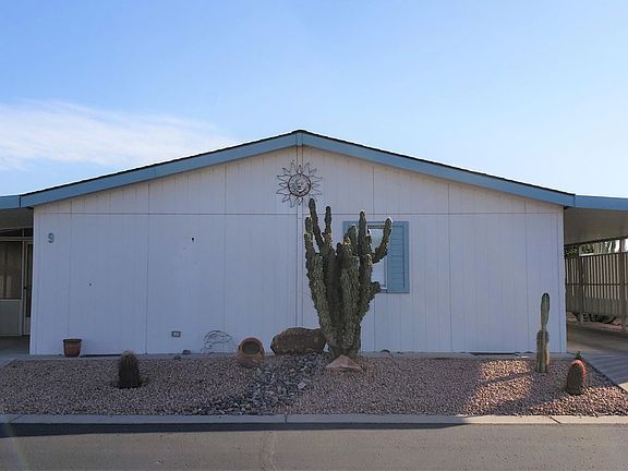 1998 Palm Harbor 28x49 Ground Set split floor plan with 2 master bedrooms + Den located in peaceful Saguaro Canyon Village. Larger master bedroom features walk in closet, large bathroom w/glass shower doors, grab bars and seat system in shower. 2nd masterbath is updated with walk in tub and plenty of privacy. Kitchen is large with tons of cabinets, light & bright with skylight and all stainless steel appliances to stay with the home. A/C replaced in 2019, large FENCED lot with fruit trees, 2 car tandem parking with space for golf cart on other side. Arizona room is screened and south side private back yard for soaking up some sunshine. Lot rent is $620, pets allowed, all new owners must be approved by the park office.