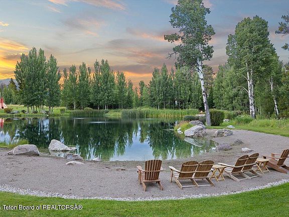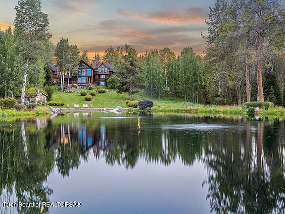 Embrace the dramatic beauty of the Teton Range with this extraordinary legacy estate, set on 22.70 private acres just 12 minutes from Wilson, Wyoming. This stunning lodge-style home features floor-to-ceiling windows inviting majestic mountain views into every room. A private swimming pond, complete with a sandy beach and dock, serves as a central location for recreation or entertaining. Bordering millions of acres of National Forest, this property offers unparalleled access to hiking, fishing, and outdoor adventures.