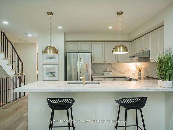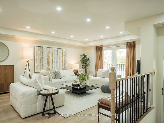 Welcome to this beautifully updated 3-bedroom plus den townhome located in the highly desirable Churchill Meadows neighbourhood with 2 parking spots. The open-concept living and dining areas feature upgraded flooring, upgraded lighting, a neutral colour palette, and seamless access to a Juliette balcony and a large terraceperfect for entertaining. The modern kitchen boasts quartz countertops, a breakfast bar, and sleek stainless-steel appliances. Upstairs, you'll find generously sized bedrooms, full main bath and a primary retreat with two walk-in closets and a luxurious 4-piece ensuite. Additional highlights include high smooth ceilings, pot lights throughout, interior garage access, and parking for two. Ideally situated within walking distance to parks, top-rated schools, shops, and just minutes from major highways, this home offers both convenience and sophistication.