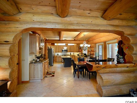 Spectacular Engelmann Spruce Canadian Log Cabin on a granite studded lot is a rare treat. Quality built with care: Trex decking, tankless water heater. Every inch of this home is meant to be strong and solid for a long time. The elegant master suite has a fireplace that is visible from the tile shower & tub. A coffee nook for those snowy mornings when you just want to stay cozy. Large walk-in closet. Hand scraped hickory flooring in the living w/ceramic 18" tile in dining & kitchen. Granite counters w/tile backsplash & hickory cabinets accent the kitchen w/GE profile appliances. The huge rec. room has its own fireplace and opens onto the spa deck which further leads to the yard set up for summer relaxation & dining. How about a soak in the Lasco tub? This home has such possibilities !