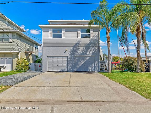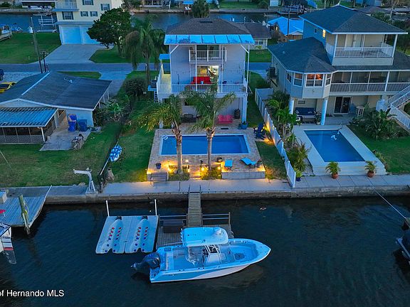 Welcome to your piece of paradise in Hernando Beach! NEWLY REMODELED OCT 2024 gorgeous primary bath! This stunning, DIRECT GULF ACCESS waterfront property offers breathtaking panoramic views of both sunrise and sunset, providing the backdrop for your daily relaxation! This 3 bedroom, 2 bath home has been tastefully updated with a modern interior and high-end finishes throughout, IMPACT WINDOWS/SLIDERS, and an AC from 2022.  The outdoor space is truly one-of-a kind with a BRAND NEW heated in-ground POOL and paver patio, that will be the perfect spot to soak up the sun and enjoy the beautiful Florida weather! The home also comes equipped with a floating dock and double jet ski dock. The 1st level includes the 2-car garage with separate storage area with new window addition on the back of the house. The second and third level feature your finished living space. The second level boasts new luxury vinyl flooring throughout and a remodeled kitchen with white shaker cabinets, subway tile backsplash, and granite counters. In addition, you will find two guest bedrooms, a guest bath and indoor laundry room. The living room includes oversized sliders that lead out to the covered patio, offering a great spot to entertain and take in the incredible views. The third level is dedicated entirely to the primary suite, providing the ultimate retreat. It includes carpet in the bedroom with a walk-in closet and its own private balcony! The ensuite bathroom features a double sink vanity and large soaking tub. Hernando Beach is a charming waterfront community along Florida's Nature Coast, known for its picturesque canals, peaceful atmosphere, and easy access to the Gulf of Mexico. Boating, fishing, and stunning sunsets are just a few highlights of this coastal paradise. With local shops, restaurants, and a friendly community vibe, Hernando Beach offers the perfect blend of relaxation and adventure for those seeking a slice of paradise on Florida's Gulf Coast. Don't miss out and schedule your showing today!