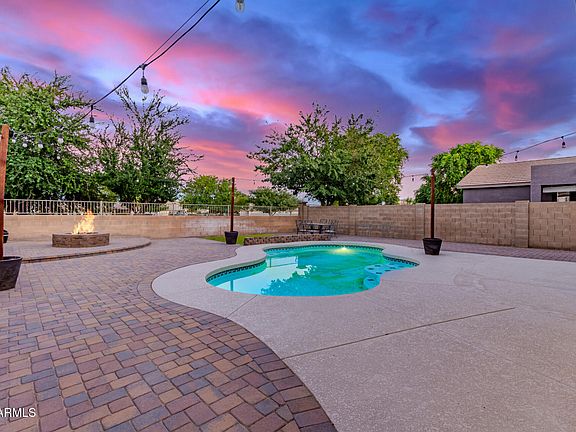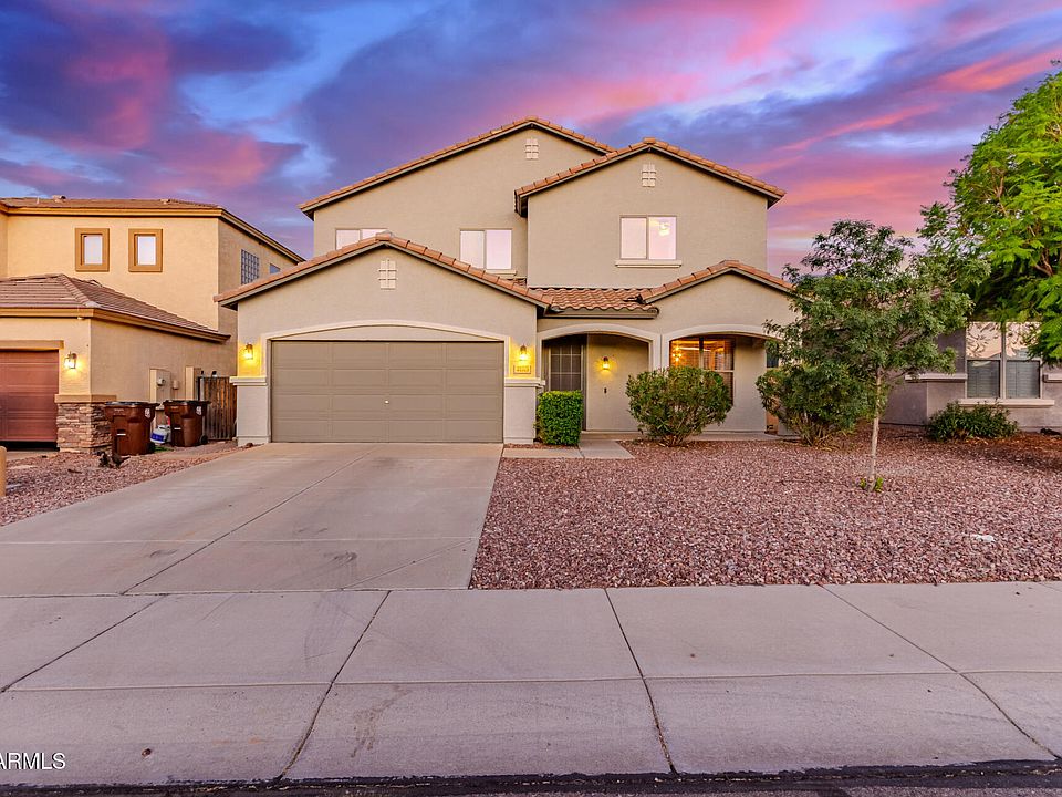 Scenic sunsets and everyday comfort await in this delightful 2-story home! A welcoming 2-car garage leads inside to a cozy living room and a relaxing family room with tile flooring in all the right places. Kitchen is a showpiece with stainless steel appliances, mosaic backsplash, granite counters, custom cabinets, a walk-in pantry, and a center island with a breakfast bar. Unwind in the main bedroom featuring a spa-like bath with marble dual sinks, a soaking tub, and a walk-in closet. Secondary bedrooms offer mirrored closets for stylish storage. Outside, enjoy the spacious backyard with a covered patio, sitting area, fire pit, and a sparkling pool perfect for entertaining or quiet evenings. With charm inside and resort-style living outside, what's not to love? Experience it for yourself! Frisbee golf as part of the community features.
