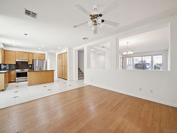 Two Story House with three bedrooms and three bathrooms, including one bedroom and full bathroom on the first floor. Formal living room and dining room. Kitchen with granite countertops opens to family room with fireplace. Two bedrooms and two bathrooms upstairs with a large loft. Private, low maintenance backyard. Three car garage. Community pool, spa and parks. Easy access to highway 76 and 15.