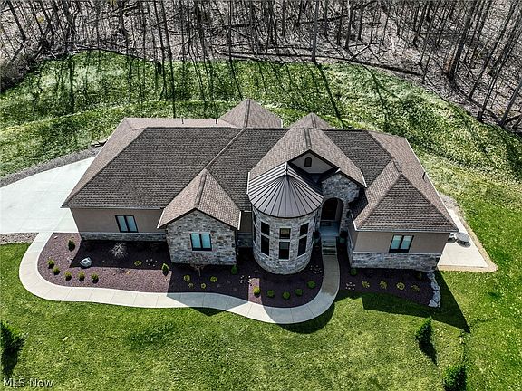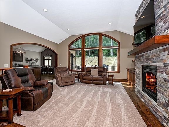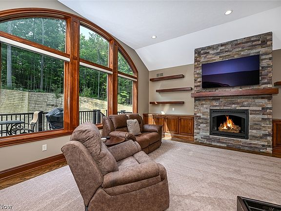 Stunning custom built home perched atop hillside with breathtaking views. Rich crown moldings, solid doors & hardwood floors bring warmth & richness throughout while exuding quality & detailed craftmanship. State of the art kitchen is true masterpiece, featuring expansive center island with soapstone counter, custom cabinetry & top-of-the-line appliances that cater to every culinary need. Dining area flows seamlessly of kitchen, walls of windows provide great views with outdoor access to full deck. Natural light floods great room with vaulted ceiling, stone fireplace serves as focal point, custom built-ins & shelving add sophistication. Office features turret shape adding architectural interest, soaring ceilings, custom built-ins & wood floors. Owner’s suite features two-sided gas fireplace & is a true retreat. Spa like primary bath with thoughtful design & high end finishes, large jetted tub, walk-in marble shower, 2 vanities, heated floors, & custom cabinetry. Spacious 2nd bedroom with ample closet space, large windows & full bath. Walk out lower level offers a variety of amenities for entertaining & comfortable living. Media room with wet bar for movie night, 2nd office/craft room with custom shelving & workout room. 3rd bedroom with daylight windows & full bath, great for in-law or multigenerational living. Enjoy the outdoors on the sizeable deck & patio surrounded by secluded & picturesque natural setting. Easy highway access. Don't miss this stunning home!