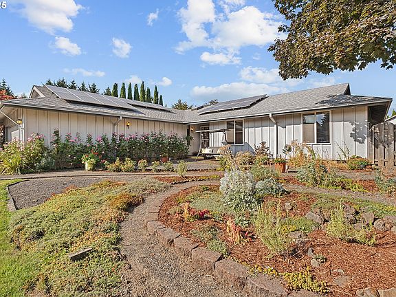 Meticulously maintained single level ranch in one of Hillsboro's most sought-after communities, Singing Woods! This 3-bedroom, 2-bathroom, 1722 square foot home sits comfortably on an oversized 10,019 square foot lot. Entertainers delight floorplan with spacious entry, formal living room with wood burning fireplace, & formal dining room. Kitchen with pantry & breakfast nook opens to skylight lit family room. Primary suite equipped with ceiling fan & dual sinks in bathroom. Large & fully fenced backyard with GORGEOUS built-in patio cover, stamped concrete patio, stone walkway, & adorable potting shed. Solar panels mean lower electric bills & heat pump for heating or cooling. Potential for RV parking. Located down the street from the beautiful 61 acre Rood Bridge Park, Hillsboro High School athletic fields, & minutes to shopping, restaurants, multiple Intel campuses, Nike, & more. HiLight fiber optic internet available in the neighborhood! [Home Energy Score = 8. HES Report at https://rpt.greenbuildingregistry.com/hes/OR10239697]