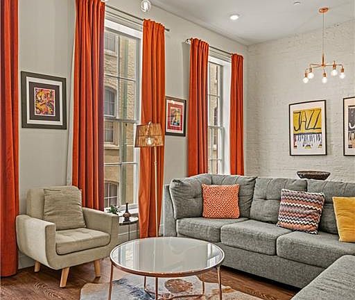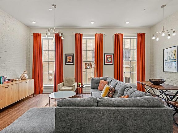 Inside Unit 206, known as The Hearst, you’ll find a bright two bedroom, two bathroom condo with tall windows. The living space features exposed brick walls, warm hardwood floors, and vibrant design touches including bold drapery and modern lighting. The open kitchen offers stainless steel appliances, and the generous layout includes ample closet storage, washer and dryer hookups, and the option for all furnishings to remain, making it move-in or guest-ready.