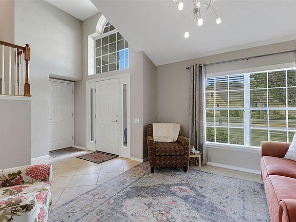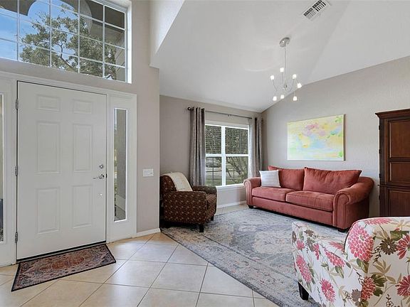 Drive through the gates into the oasis that is Del Webb Orlando and fall in love with this beautifully updated two-story residence. On a prestigious corner lot with a stunning mature live oak tree and overlooking the White Heron golf course, this immaculate 2,086-square-foot home combines timeless style with modern upgrades. The floor plan features a first-floor primary suite with a luxuriously remodeled bath and walk-in closet and a second bedroom/den with an adjoining remodeled bath. The primary suite bathroom features two sinks with quartz countertops, a stand-alone modern tub, modern floor-to-ceiling tiles, walk-in shower, linen closet, and private water-closet. The second bathroom features a remodeled floor-to-ceiling tiled shower with glass doors. The upstairs loft houses the third bedroom, bathroom with a tub convenient for children’s baths, and lovely front room full of natural light perfect for a sitting room, art room, or office. Ceiling fans throughout the house provide year-round comfort. You enter the home through the front door with side lights into the airy, open floor plan onto the enclosed lanai with golf course view. The eat-in kitchen features stainless steel appliances, a recently purchased refrigerator with French doors and two freezer drawers, gas stove, granite countertops, wood cabinets with bottom pull-outs and a tile backsplash. The property’s prime location has tons of space to build the lanai of your dreams. For space launch lovers, sit on your lanai and watch exciting Cape Canaveral launches day or night. Recent improvements to the home include a new roof installed in 2023, two remodeled bathrooms with comfort height toilets, fresh interior paint, new upstairs flooring, and an upgraded made-in-USA stainless steel Navien tankless hot water heater for maximum efficiency and energy savings installed in 2025. The $425 semi-annual HOA fee provides 24x7 staffed security gate and master association-owned private road maintenance. Adjacent to recently renovated 18-hole White Heron Golf Club. The $328 monthly Del Webb HOA fee includes lawn maintenance and exclusive access to resident-owned 30,000+ SF Montecito clubhouse and amenities. DEL WEBB ORLANDO is a 55+ community with a tavern, indoor walking track, fitness center, indoor and outdoor pools and spas with locker rooms and showers, billiards, ping pong, craft room, and a ballroom for special events. Outdoor activities include pickleball, tennis, bocce, basketball, shuffleboard, community gardening center, an outdoor amphitheater, large brick fire pit and large screened-in gazebo over the water. Miles of biking and walking trails within Ridgewood Lakes gated community. Located conveniently to shopping at Posner Park (4 miles), Disney World, Universal Studios, Orlando & Central FL entertainment nearby. Easy access to I-4, medical facilities, airports & Sunrail Station. Advent Health hospital is 3 miles away.