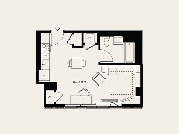 Washer dryerFilled with natural lightStainless steel appliancesWindow coveringsWide plank flooringStone kitchen counter topsSpacious studio