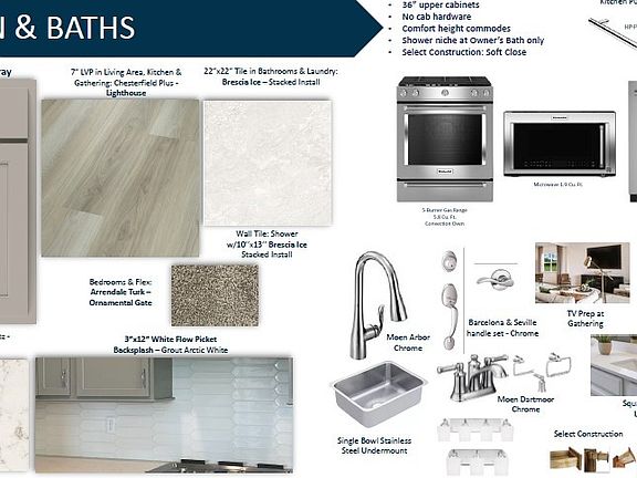 Large islandCovered lanaiWhite flow picket backsplashQuartz countertopsStone gray cabinetryGourmet kitchenSpa-inspired ensuite bath