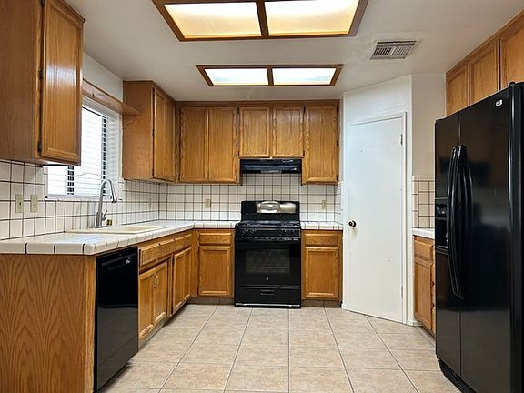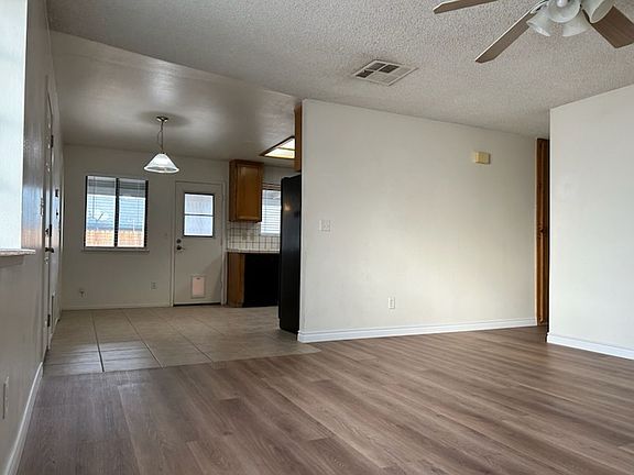 1204 sq. ft. 3 bdrm, 2bath home. U shape kitchen with black appliances. New range & dishwasher, tile counter tops & backsplash, eat-in kitchen area, with tile flooring. Brick fireplace in living room, and new luxury faux wood laminate flooring. Luxury faux wood flooring also in hallway, bathrooms and primary bedrooms. Carpet in two bedrooms. Primary bedroom has a primary en suite with a stand alone shower, and sliding doors to covered patio. Large covered patio. Evaporative cooling and forced air heating. Washer/Dryer hook-up(gas & electric). Located in the garage. Double door black fridge provided but not warrantied. Pets allowed (limit 2 pets, must be approved by management). Large backyard.