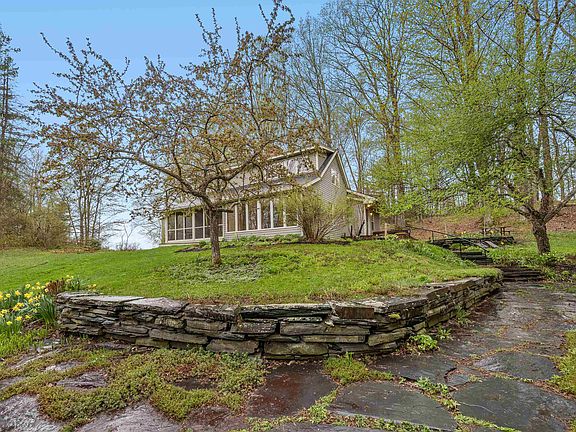Nestled on historic Old West Church Road, near Maple Corners and the revered Kent Museum, this contemporary cape awaits. Situated on a private terrace surrounded by blossoming flowers and verdant trees, it offers a serene retreat with a special view of the neighboring meadows and the iconic steeple of the Old West Church. Inside, you're greeted by a spacious tiled mudroom with a sizable pantry closet. The main level boasts a generously sized bedroom and full bathroom accessible from the entry area. The country kitchen exudes charm with slate tile flooring, pine cabinets, and wood and tile countertops. Connected to the kitchen is a sunlit dining area with a full wall of windows. Adjacent to the dining area, the charming screened porch is a space you are sure to enjoy. The inviting living room features a cozy brick fireplace and steps down to a sunroom illuminated by a large skylight, creating a welcoming space for relaxation and entertainment. Upstairs, a walk-through study or office with built-ins, leads the way to the primary bedroom and a tiled 3/4 bathroom. The primary bedroom boasts custom-built knee wall cabinets and ample storage space, blending style and functionality. A second bedroom on the upper-level charms has cathedral ceilings and softwood flooring. The basement offers utility space with laundry hookups. Additionally, a detached two-car garage provides extra storage space for your convenience. This exceptional property awaits its discerning new owner.