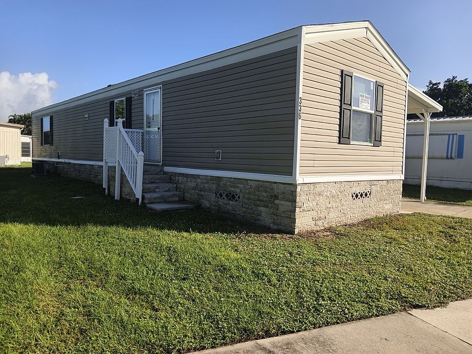 -- Spacious (2022) 2 Bedroom / 2 Bath Located in Lakewood Village, 55+ Retirement Community -- Major Appliances Include: Washer, Dryer, Refrigerator and Stove. Featuring an Extended Covered Car Port, Central AC, Shingled Roof, Vinyl Siding and a 10 x 12 Attached Storage Shed. Moving in is made easy with this Newer Clayton Model! Lakewood Village's market-rate Base Lot Rent is approximately $850 a month. MUST BE PARK APPROVED.. Call today to schedule a showing -- Don't miss out on this opportunity to purchase a newer home in great condition at an affordable price! Lakewood Village is a desirable neighborhood conveniently located near beautiful white sandy beaches and just a short drive to the Orlando Melbourne International Airport. This quiet, age-restricted 55+ community is loaded with amenities, including a Fitness Center, Game Room, Swimming Pool, and Shuffleboard Courts, to name a few. Water, Sewer, and Trash are billed through the Park. All listing information is deemed reliable but not guaranteed and should be independently verified through personal inspection by appropriate professionals. Our company does not and cannot guarantee or warrant the accuracy of this information or condition of this property. Measurements are approximate. The buyer assumes full responsibility for obtaining all current rates of lot rent, fees, and pass-on costs. Additionally, the buyer is responsible for obtaining all rules, regulations, pet policies, etc., associated with the community, park, or home from the community/park manager. Our company is not responsible for quoting said fees or policies.
