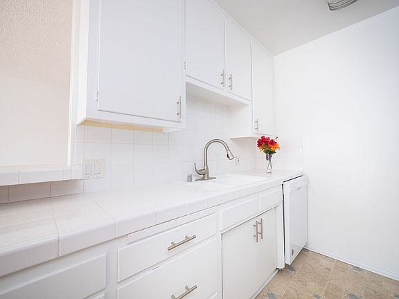Features tile flooring, white ceramic tile countertops, breakfast bar, and brand new stainless steel appliances including gas oven/stove, dishwasher, and over-the-range microwave. Ample cabinet space, new light fixture, and double stainless steel sink with tall spout faucet.