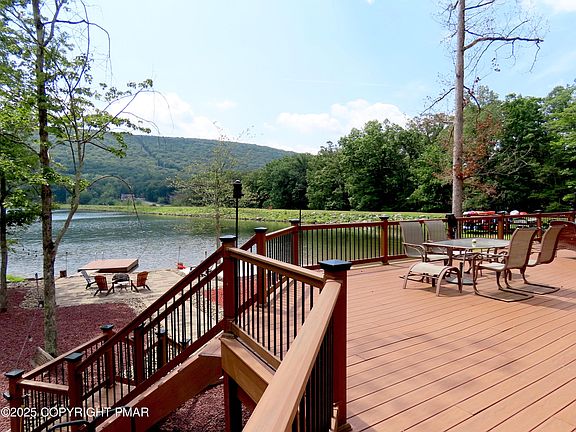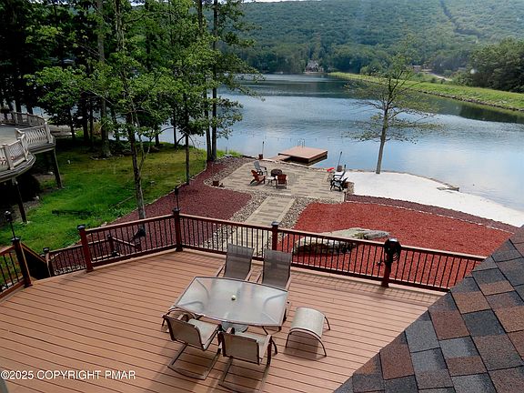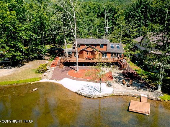 LAKEFRONT holistic retreat nestled in the heart of the Blue Mountains in sought after Eagle Rock Golf & Ski Resort 5 star-ALL season development is a 5 bedrooms, 5 bath contemporary Chalet offering comfortable space for multiple families! Stylish prow front features adds depth & presence to its exterior with captivating sweeping views of the crystal-clear waters of Susquehanna Lake-perfectly blending mountain charm with lakefront elegance and flair, you will be welcomed as you enter a delightful custom designed mudroom complete with picture window. bench & shower, a perfect place to drop your skis or gear after a day on the slopes. Step into the warm and inviting living room, where a gorgeous stone, floor to ceiling double-sided fireplace serves as the centerpiece of the room. Through the french doors is a bright and airy, sun-drenched sunroom with soaring cathedral ceilings, skylights and walls of windows that let in the natural light as you gaze at the incredible panoramic lake views. This massive space features warm terra-cotta style tile flooring extending from the living space, seamlessly sharing the glow of the double fireplace. The dining room faces the lake. Both rooms feature sliders that open to a massive deck ideal for entertaining or simply soaking in the scenery. The functional kitchen offers direct access to the laundry closet and a nearby powder room for added convenience. The primary suite is a true retreat, boasting engineered warm walnut flooring, a spacious en suite bath and enormous walk-in closet. From here, you'll wake up each morning to breathtaking lake views. Additional features include a storage closet and an attached two-car garage.Moving to the upper level, you'll discover 3 beautifully remodeled bedrooms featuring stunning walnut wood floors. These rooms are complemented by 2 custom-designed bathrooms, each thoughtfully remodeled with soaking tubs and custom cut windows that frame breathtaking views of the mountains & lake, creating an open and inviting atmosphere. Simple seamless glass doors open to sleek showers featuring elegant Calacutta marble tiled walls adorned with black and white pebble tile accents thoughtfully carried through to border the tub area tying these spaces together with sophisticated contrast and timeless charm..The lower level was completely transformed to create a versatile and harmonious living space, with natural pine walls showcasing soft golden hues.This level includes a remodeled 5th bedroom with new flooring and an en-suite bathroom, alongside a family room that can function as a game room, gym, or flexible living area. This space offers many possibilities and can even be used as an in-law suite! And if that's not all, be prepared to be amazed by, a walk-out to instantly connect with the stunning outdoor oasisa beautifully landscaped yard that flows effortlessly to the shimmering lake's edge, inviting you to relax, entertain and soak in the awe-inspiring water views! The sellers spared no expense in having the yard beautifully designed with elegant paver patios that create distinct spaces for relaxation and recreation, seamlessly integrated with lush gardens and carefully tended beds. Fresh mulch accents the landscaping, enhancing the vibrant greenery and adding a polished, serene ambiance throughout the outdoor area. This is a rare opportunity to own a beautiful corner property overlooking a pristine lake, complete with a private dock, spacious backyard, expansive deck, cozy fire pit, and million dollar views that are sure to last a lifetime! Experience true lakefront living and still water moments mirrored with sunsets in this highly sought-after 4-season community!