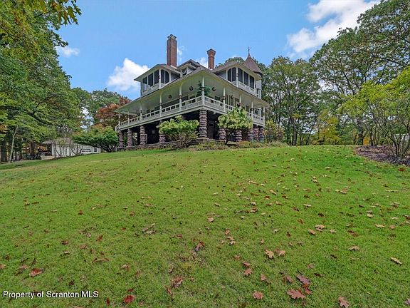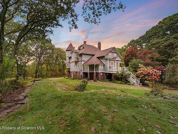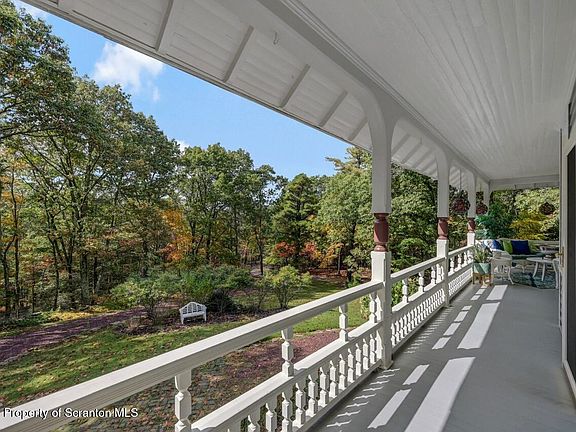 Exquisite private home, beautifully enwreathed in a wraparound porch, second floor balconies and large windows to take in the serene 4 acre setting, all just minutes from I-81 and I-476. This Queen Anne style Victorian is fully furnished and fully modernized from top to bottom. Dream kitchen includes stone counters, deluxe appliances, pantry and attached laundry room. Elegant dining and living rooms with fireplaces and ornate details, enjoy entertaining or just relaxing with your favorite music in the Great Room. Separate study could easily be a fourth bedroom or use as a home office. Full bathroom on the main floor or enjoy the second floor spa-like large bathroom with jetted tub, separate shower, surround sound. Dressing room and screened-in sitting porch off of primary suite. Two additional bedrooms, another bird's nest view porch and a third floor studio/fitness room. Finished 'lower level' is a fantastic space for entertaining and walks out to the yard and fire pit area. Rental includes a house manager, a garage, lawn maintenance. Enjoy the best of old and new in this completely charming home because you're worth it.